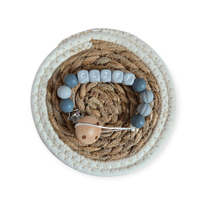 De siliconen kralen zijn gemaakt van 100% food grade siliconen en vrij van BPA, PVC, lood en weekmakers. De houten kralen zijn gemaakt van onbehandeld beukenhout. De clip van het speenkoord met naam is van hout, en heeft 3 ronde gaten erin. Hiermee kan het speenkoord met naam gemakkelijk vast geklikt worden aan de kleding van uw kindje.