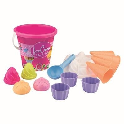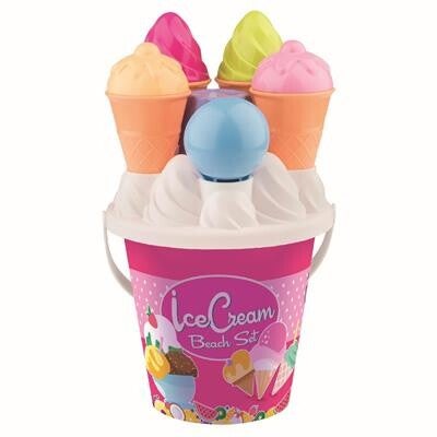 Deze 7-delige speelgoed emmerset is uitgevoerd in Ice Cream design en is verkrijgbaar in 2 verschillende kleurencombinaties. De emmer inclusief hengsel heeft een doorsnede van 17 cm. Tevens wordt de set geleverd met leuke accessoires: 4 speelgoed ijshoorntjes, een ijslepel, 7 zandvormpjes en een zeef.Maak de lekkerste ijsjes van zand! De set is gemaakt van kunststof en heeft een robuust design voor jarenlang speelplezier. Ideaal om mee te badderen in bad of leuk voor aan het strand! Geschikt voor kinderen vanaf 1 jaar.