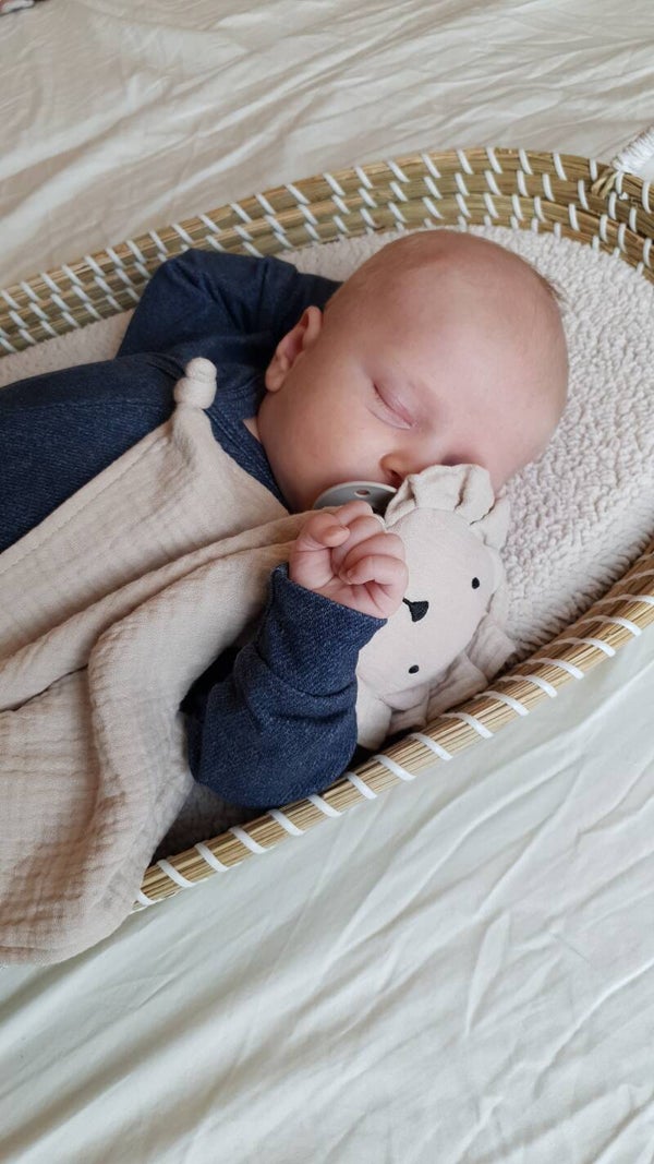 Dit knuffeldoekje is gemaakt van 100% GOTS-gecertificeerd organisch katoen. De vulling van het hoofdje is van maïs vezel. Maïs vezel is een 100% plantaardige vezel en volledig biologisch afbreekbaar. Het is hypo-allergeen, geurloos, anti-bacterieel, biologisch afbreekbaar en 100%composteerbaar.