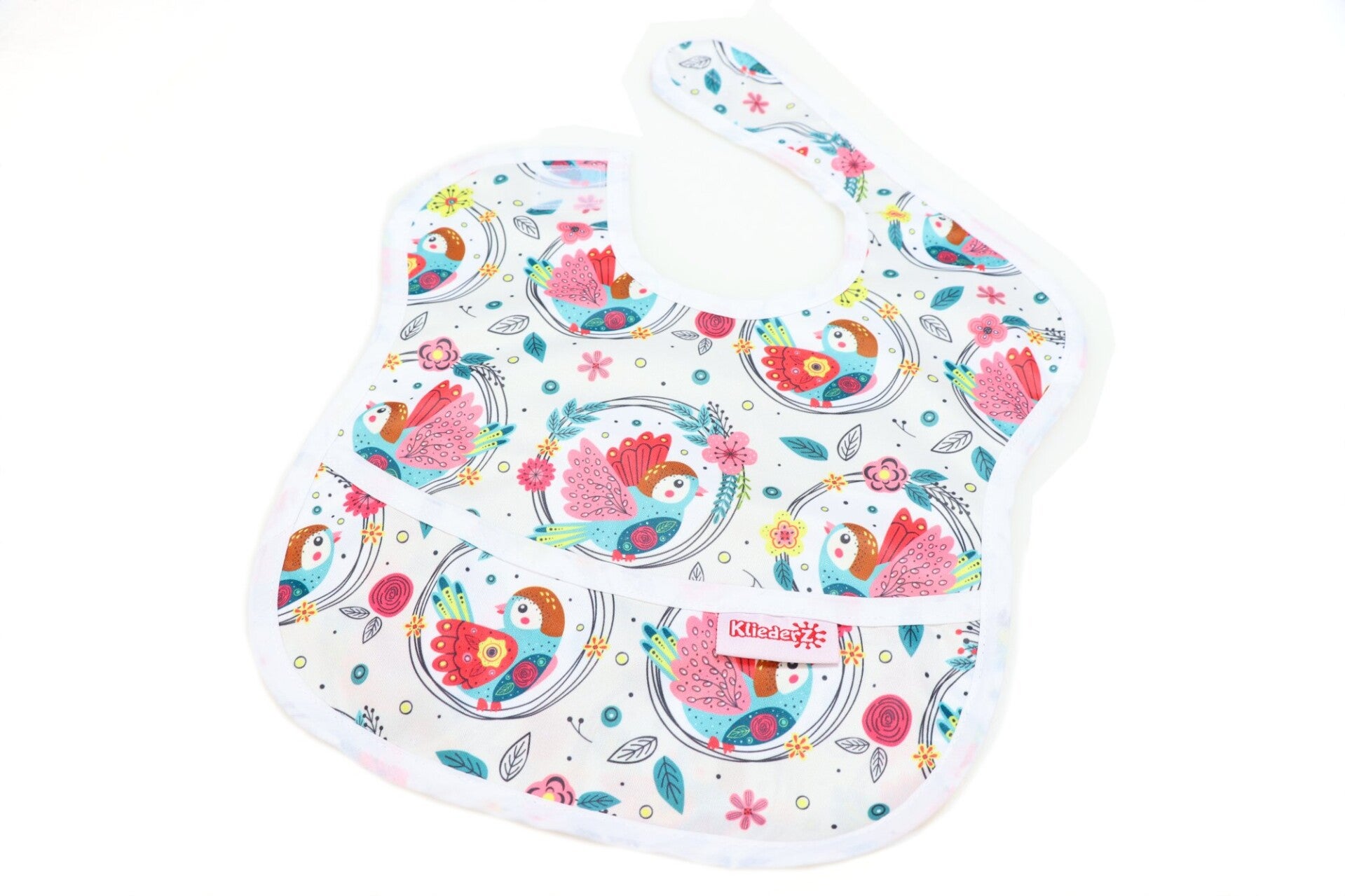 Fijne slabbetjes met een opvangbakje voor meisjes. Dit is een set van twee eetslabbetjes voor je kleine dreumes. Met leuke prints van vogeltjes zit je kleintje ook nog eens stijlvol aan tafel. De slabbetjes zijn makkelijk om te gebruiken en hebben een fijne stevige klittenband sluiting op de schouder en zijn gemaakt van een waterafstotend materiaal. Het opvangbakje zorgt er voor dat er minder eten op de grond valt.