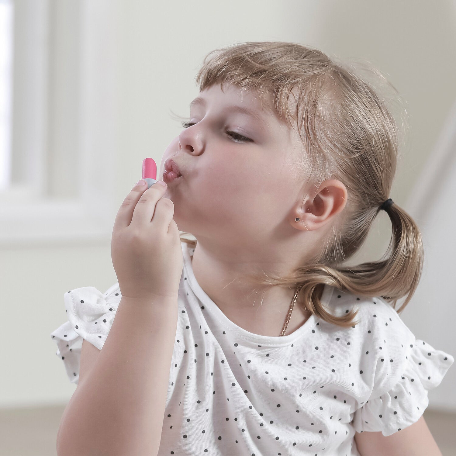 In het koffertje zit een kam, een spiegel, een flesje parfum, een crème, een poederdoos, een nagellak, een lippenstift en een oogschaduw met dubbel opbrengkwastje.