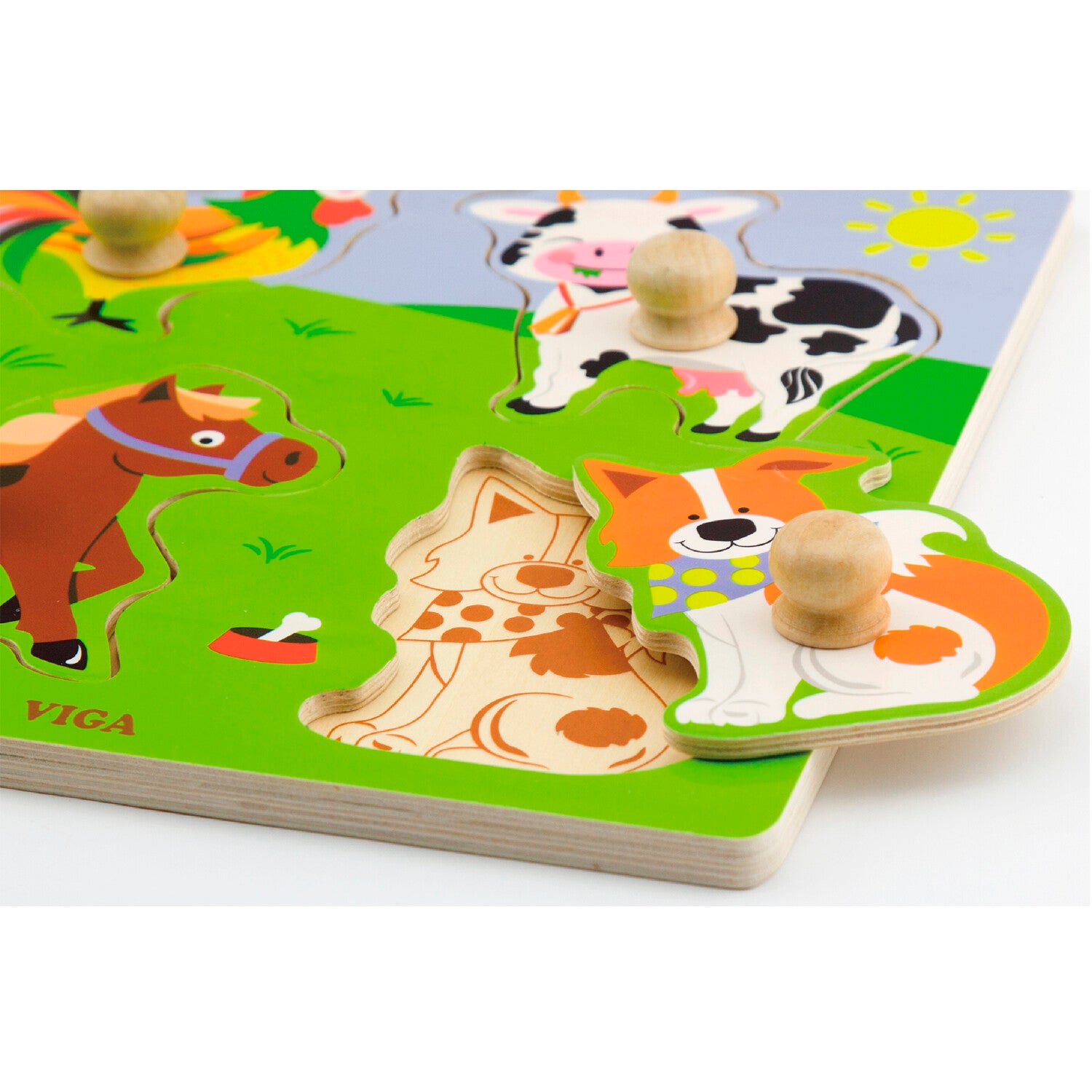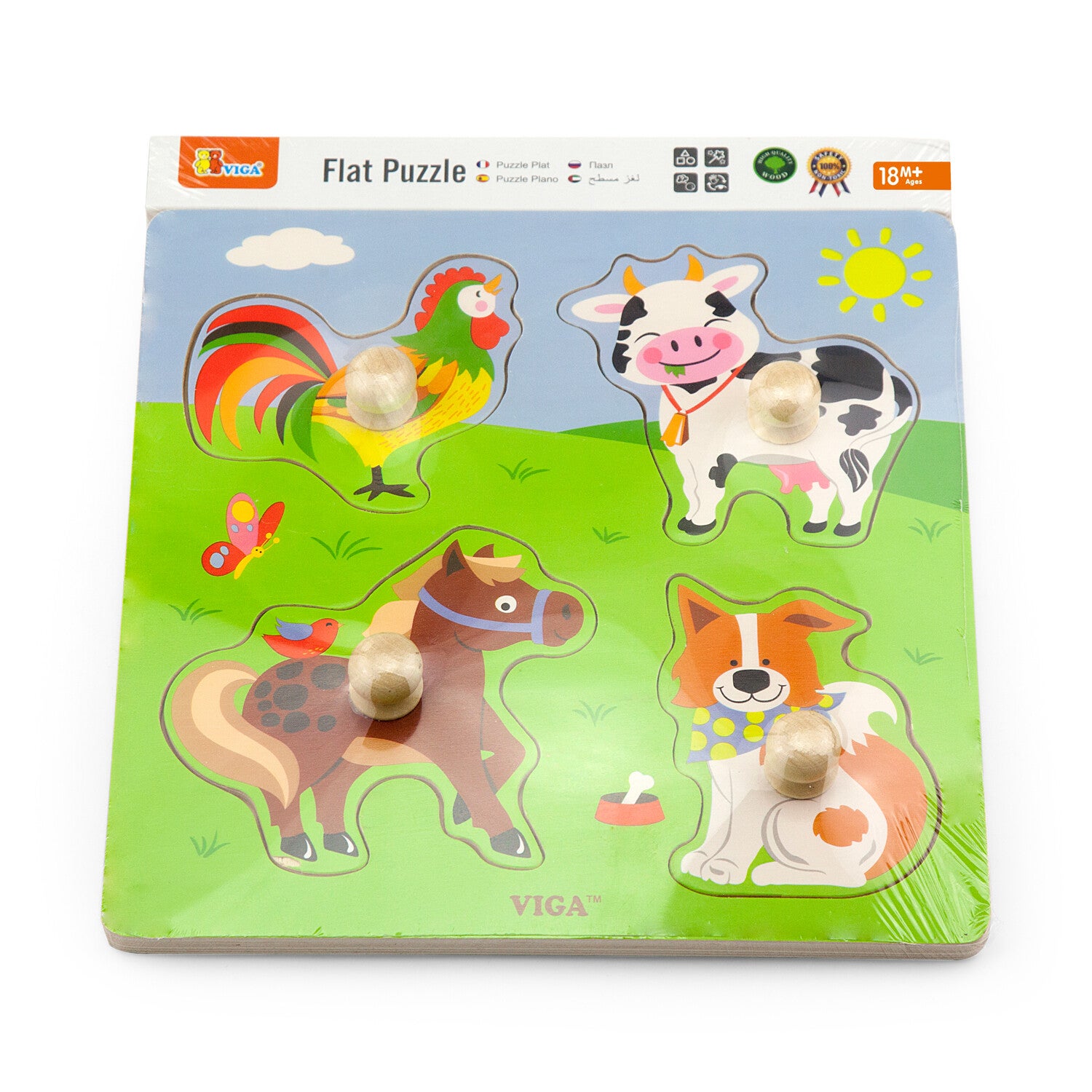 Een eenvoudige knoppuzzel met 4 boerderijdieren en grote houten knoppen. De afbeeldingen onder de puzzelstukken maken het eenvoudig en leuk. Stimuleert het herkennen van vormen, kleuren en de fijne motoriek. Puzzelbord met vier puzzelstukken.