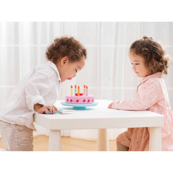 Vier iedere dag een verjaardag met dit prachtige houten snijset, blaas de kaarsjes uit, zing een liedje en snij de taart in stukjes. Stimuleert de puzzelvaardigheid bij kinderen door de taart weer in elkaar te zetten. Complete verjaardagstaart van 5 stukken taart met klittenband verbinding, 5 kaarsen en taartschep op een mooie taartschaal.