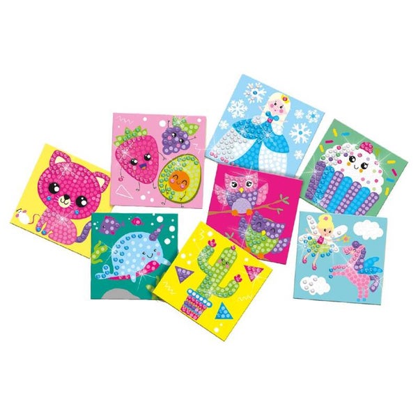 Diamond painting junior. Doordat de glimmende diamantstippen zelfklevend zijn, plakken ze heel gemakkelijk op de kleurrijke kaarten! Inhoud: 1080 diamant stickers in 6 kleuren en 8 mozaïekkaarten. Wordt in full-colour doos geleverd. Geschikt voor kinderen vanaf 3 jaar.