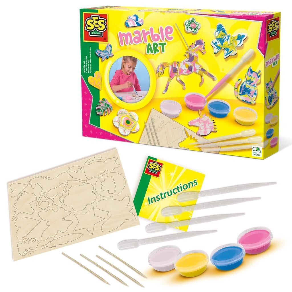 Wauw, wat een prachtige creaties! Met deze knutselset maak je deze kunstwerkjes met marmer effect helemaal zelf. Versier de houten vormen met de vier kleuren marble verf en gebruik de cocktailprikkers om het marmer effect toe te voegen. Door de cocktailprikker volgens bepaalde patronen door de natte verf te trekken ontstaan er leuke figuurtjes, gaaf hè? Wordt geleverd in full-colour doos. Geschikt voor kinderen vanaf 5 jaar.